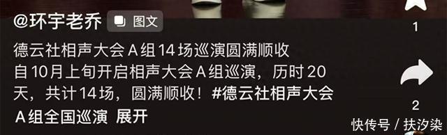 环宇老总深夜发文,德云社相声大会A组,20天巡场,圆满顺收。发文时,乔总的IP归属地在上海。从德云社专场安排可以初判,乔总在为周六晚的郭德纲、于谦而忙碌。相声大会A组,20天演场,都去了哪些城市呢?为什么安排相声大会的巡演呢?接下来还会继续吗?德云社目前的相声组合都有哪些呢?11月份,又都有哪些期待呢?